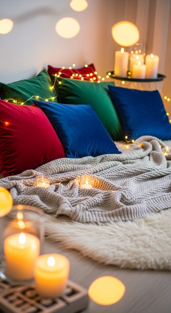 Pick soft, plush pillows in rich fabrics like velvet, faux fur, or brushed cotton. Colors such as deep red, blush, cream, or warm cocoa tones evoke a sense of comfort and closeness. Add a large shared throw blanket, a faux fur rug, or a loveseat-sized floor cushion to accommodate two people.