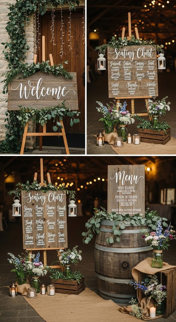 Wooden signs guide guests while reinforcing a cohesive rustic theme. Whether stained, painted, or left in their natural grain, they add texture and character to any wedding layout.