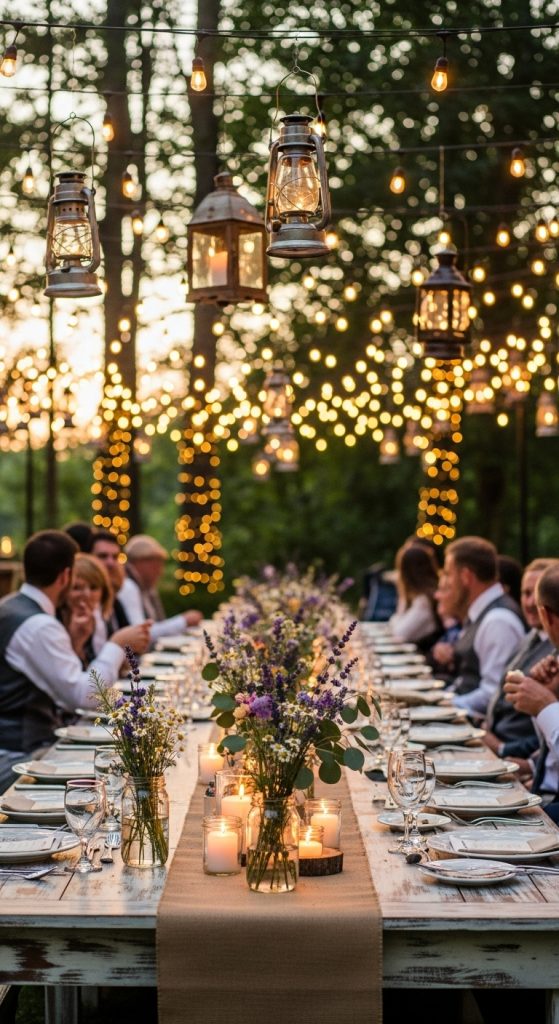 Lighting plays a crucial role in creating the warm, romantic atmosphere rustic weddings are known for. Lanterns—metal, wood, glass, or vintage—add depth, glow, and charm to both outdoor and indoor spaces.