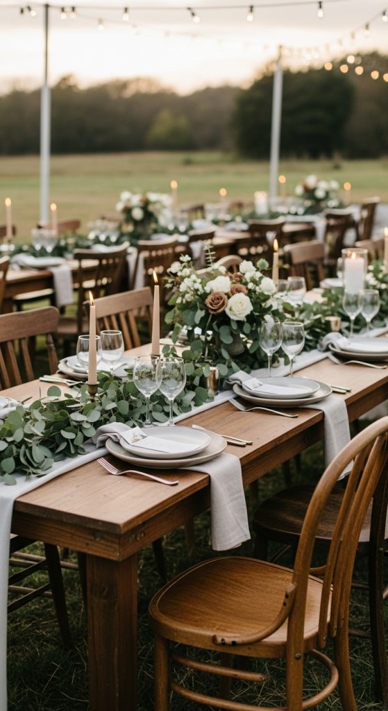 • Add eucalyptus garlands or simple floral vines as center accents.