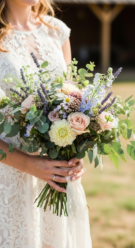 Rustic weddings embrace a natural, effortless floral aesthetic—less structured and more freshly gathered. Wildflowers, herbs, and greenery add movement, color, and softness that complement rural or outdoor venues.