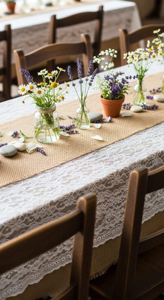 Burlap brings earthy texture and grounding warmth, while lace adds softness and elegance. Together, they transform even the simplest tables into beautiful rustic canvases.