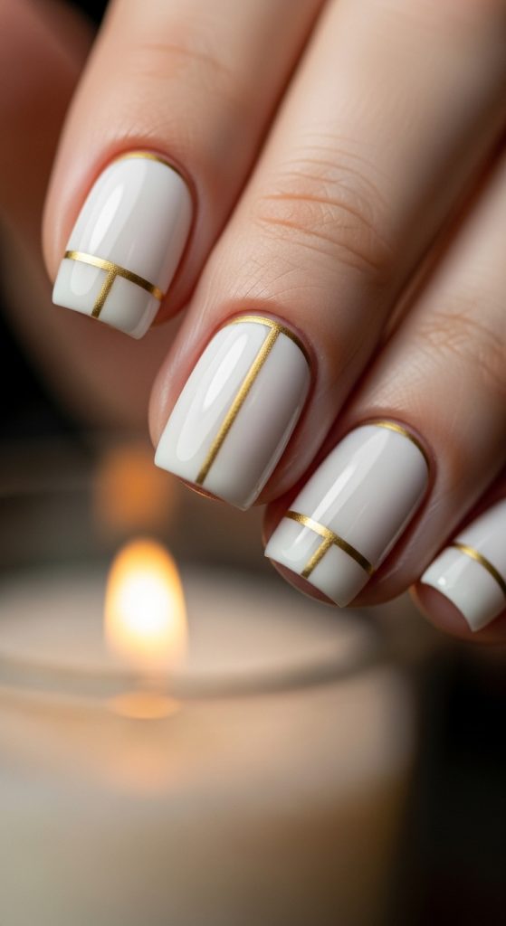 Start with a white or nude base. Then use a thin brush or striping tool to create simple red lines. The trick here is not to overdo it—just one or two stripes per nail are enough for a minimalist Christmas look.