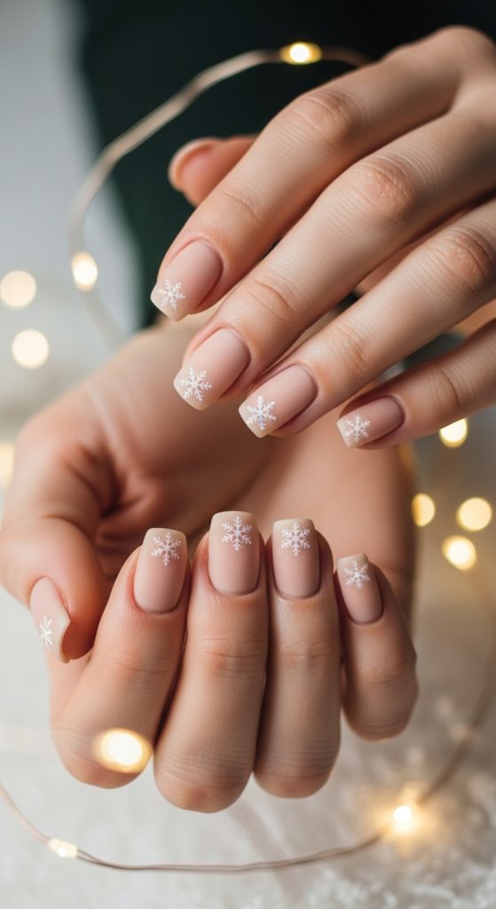 Start with a neutral base like nude, baby pink, or white. On the accent nail, add a small snowflake sticker, stamp, or hand-drawn design. Even if you’re painting them by hand, snowflakes can be simplified into a star-like shape with small lines branching out.