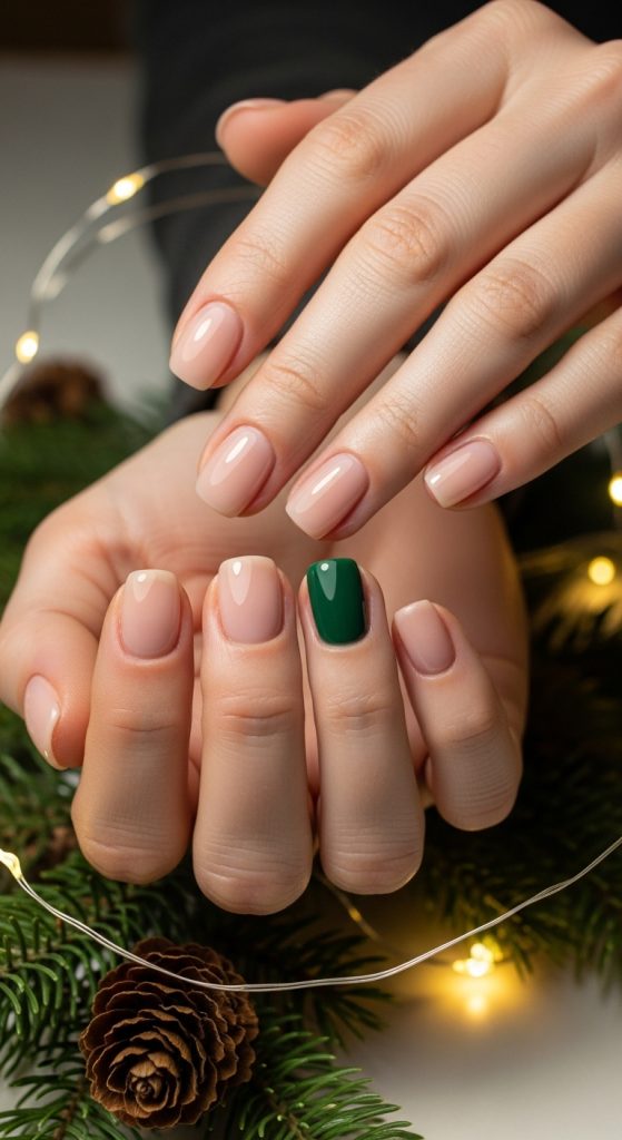 These accents create a luxurious yet minimal Christmas style. Green nails feel festive but elegant, while the gold adds sophistication without overpowering the simplicity.