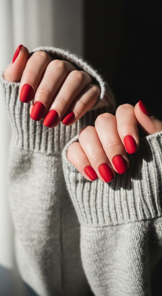 You can never go wrong with classic red nails during Christmas. A simple glossy red manicure is timeless, elegant, and instantly festive. It’s the type of design that looks beautiful on all nail lengths—from short natural nails to long almond shapes.