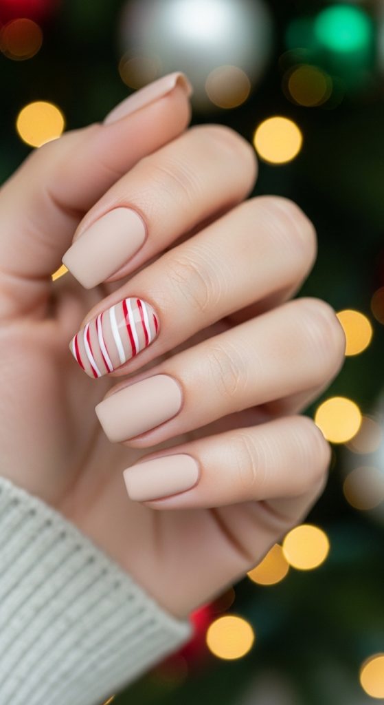 Alternatively, paint only one nail with candy-cane stripes and leave the others solid red or white. This keeps the design clean and easy while still capturing the holiday spirit.