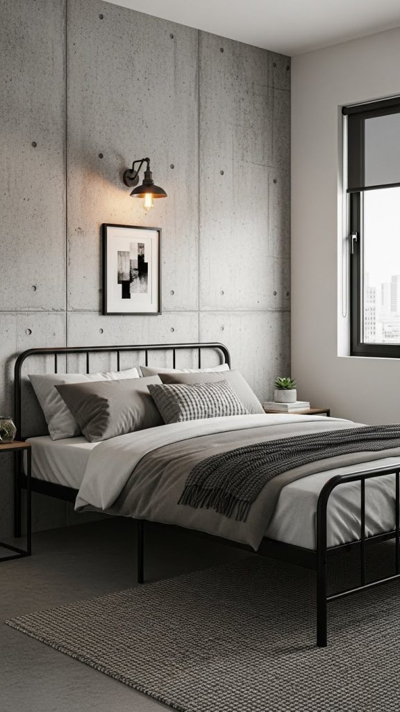 Exposed textures such as concrete, brick, or metal are balanced with neutral colors and soft bedding. Furniture is minimal, often featuring metal frames and simple designs.