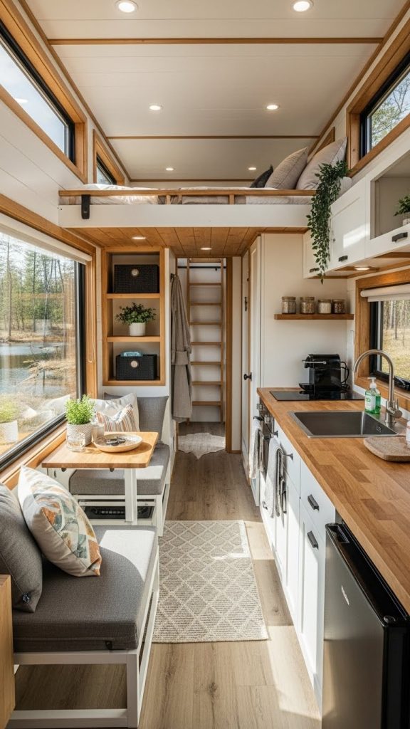 In a minimalist tiny house, the color palette is typically neutral, featuring whites, soft grays, and natural wood tones. These colors help create a sense of openness and calm. Furniture is streamlined and purposeful, often built-in to reduce clutter and maximize space. Open shelving replaces bulky cabinets, allowing residents to display only essential items.