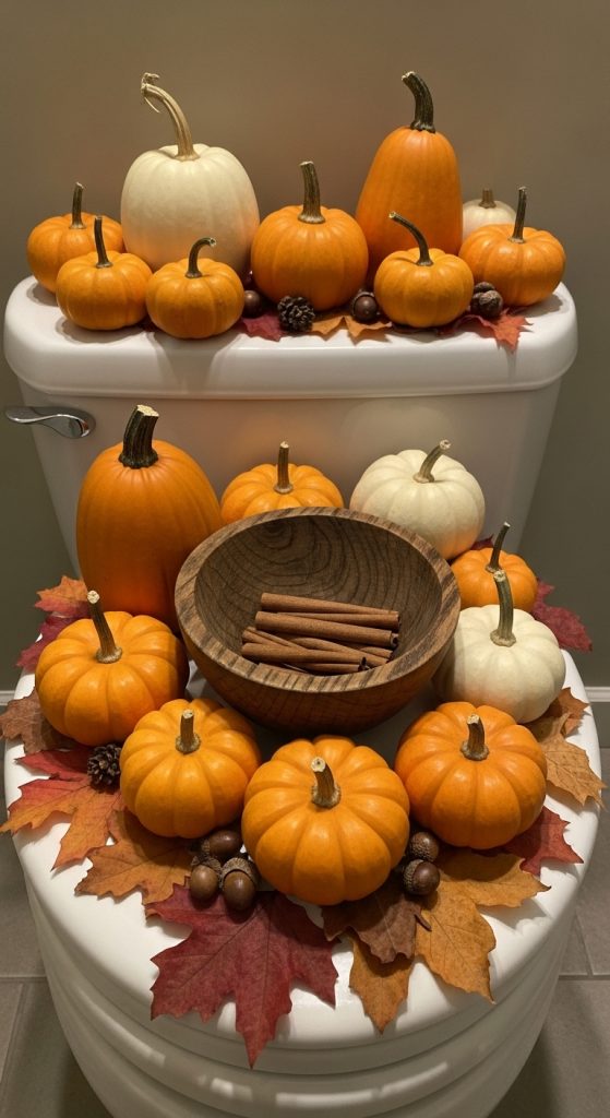 Bathrooms are prime real estate for seasonal decor—subtle, compact, and easy to change. The toilet tank, as a rectangular surface, is perfect for cyclical vignettes.