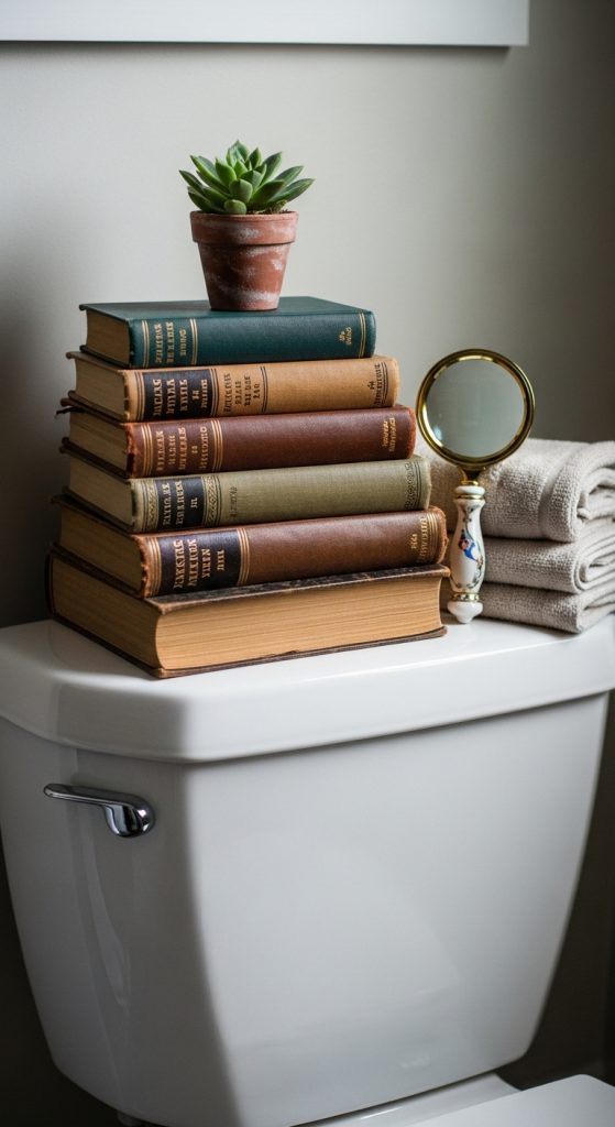 Injecting personality into bathroom decor can be challenging, but artfully chosen books across the toilet tank are distinctive and welcoming. Small hardcover volumes—on gardens, photography, or poetry—add sophistication and encourage moments of relaxation.