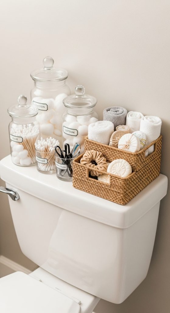 For busy bathrooms, practicality should never preclude beauty. Use the toilet tank for clever storage—attractive jars, woven baskets, or neatly labeled containers can hold cotton balls, swabs, dental floss, or spare toilet paper.