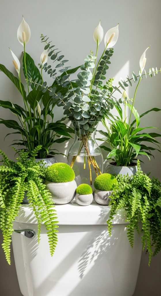 For added effect, incorporate air plants nestled among pebbles, moss balls in clear bowls, or even a small vase holding fresh eucalyptus or wildflowers. These elements bring texture and natural vitality to the bathroom, cleansing the air and softening hard surfaces.