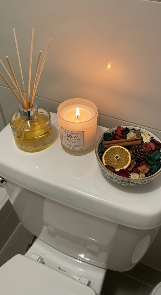 Select elegant diffusers, scented candles, or porcelain bowls filled with potpourri. Reeds diffusers work well in small spaces, slowly dispersing fragrance without flame. Choose scents that complement your bathroom’s palette—citrus or herbal for freshness; vanilla, sandalwood, or lavender for warmth.