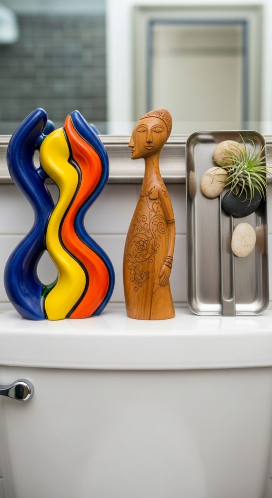 Small sculptures, pottery, or artisan pieces provide visual distinction and cultivate gallery-like ambiance. The toilet tank is a stable, eye-level perch for crafted objects.