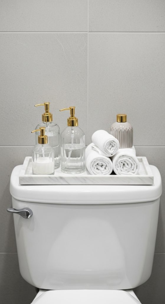 A well-chosen tray will instantly transform a toilet tank from bare to styled. Trays unify objects, signal intention, and organize essentials such as soap dispensers, lotion, or decorative bottles.