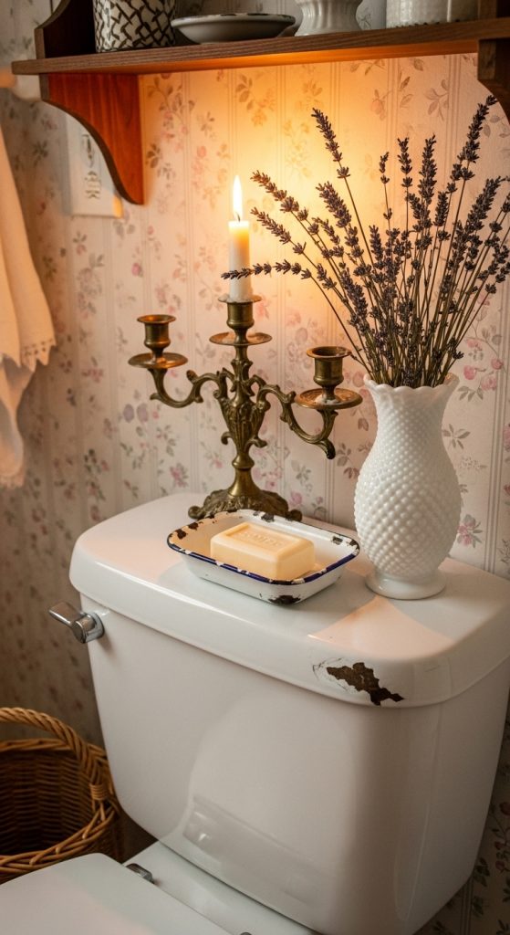 To cultivate a sense of history and eccentric charm, consider flea market finds and antiques as toilet tank decor. Seek out old perfume bottles, enamel soap dishes, milk glass vases, or brass candlesticks.