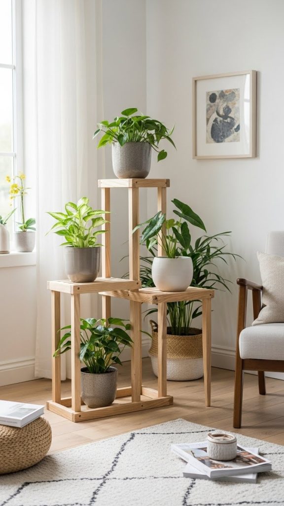 Build a simple stool-style or cross-leg stand that holds a planter. Japanese and Scandinavian aesthetics influence modern plant stand designs.