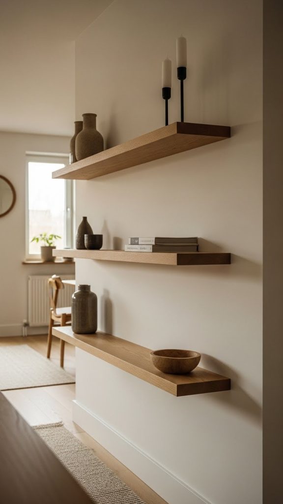 Floating shelves fit minimalist spaces when styled lightly, or they can become feature walls when layered with books, art, and small plants.
