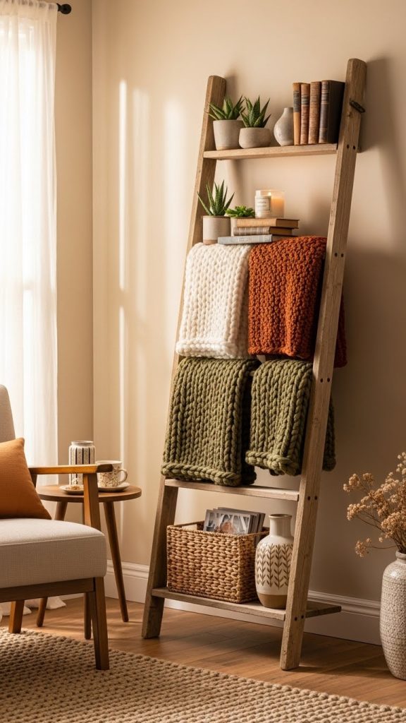 Leaning ladder décor is simple yet impactful. It doesn’t require permanent installation and offers both aesthetic charm and utility.