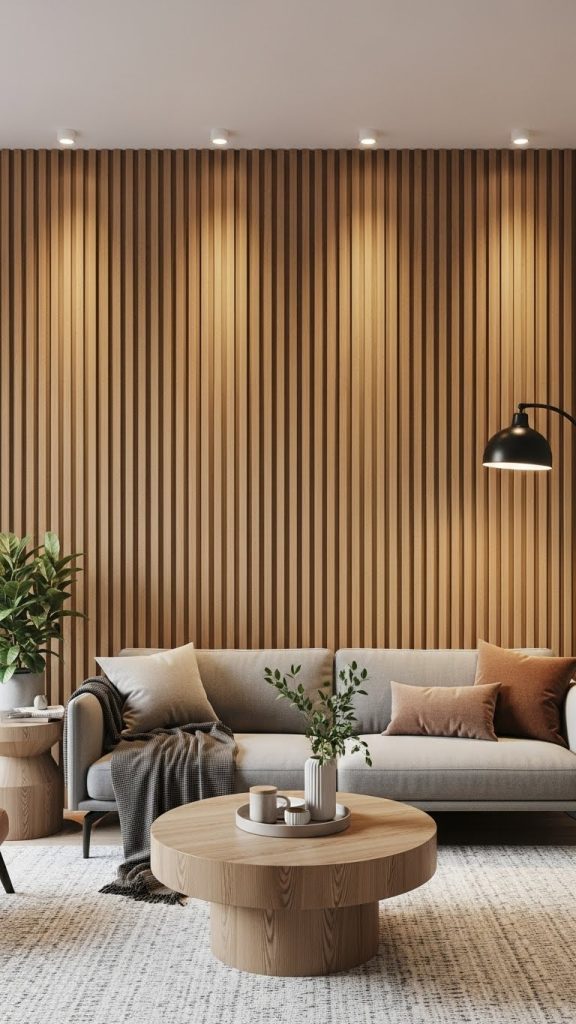A wood accent wall transforms a room instantly. It can be a full wall of vertical slats, rustic planks, geometric paneling, or modern minimalist boards.