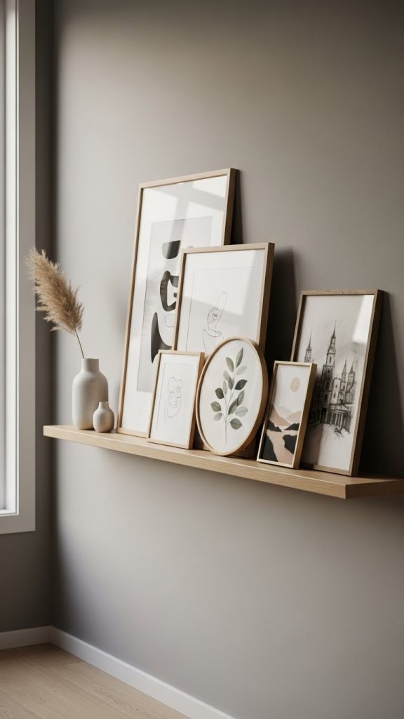 A picture ledge is a narrow shelf designed to hold frames without hanging them individually. It’s beginner-friendly and extremely versatile.