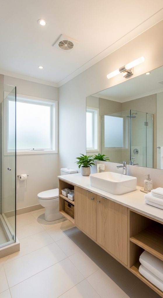 To keep the space feeling fresh, add white or neutral-colored towels, small plants, and wooden accents for a natural touch.