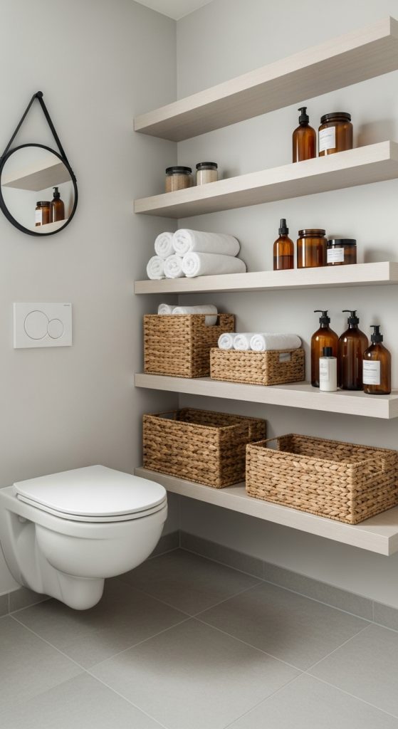 - Install floating shelves above the toilet or along the walls to hold essentials like toiletries, candles, or plants.
