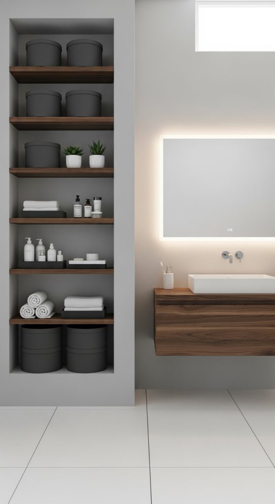 Use open shelving to display decorative elements such as plants, art pieces, or bath salts. For a more polished look, opt for wood or metal shelves to match your bathroom’s style.