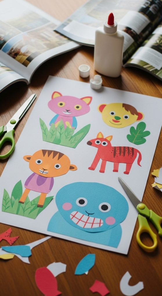 Collages let children explore creativity with cutouts from magazines or old artwork.