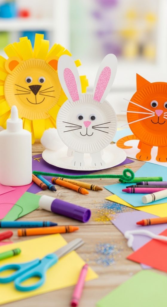 Paper plates are a classic base for children’s crafts, and when combined with construction paper, they transform into adorable animals.