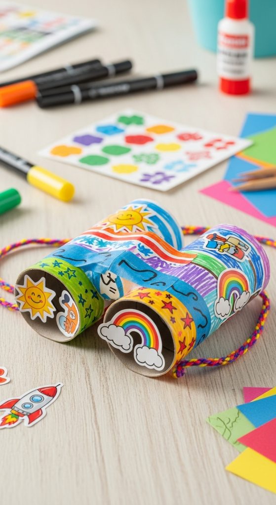 Empty toilet paper rolls can be transformed into binoculars with just some tape, string, and decorations. Kids can tape two rolls together, decorate them with markers or stickers, and attach a string to wear around their neck. They can then use their “binoculars” to go on a pretend safari or indoor adventure. It’s a simple yet imaginative craft that turns into hours of pretend play.
