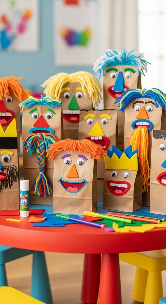 Paper bags make excellent puppet bases. With some markers, felt, yarn, and glue, kids can turn paper bags into silly faces, animals, or characters from stories. Once finished, children can create their own puppet shows, which combines crafting with storytelling and performance.