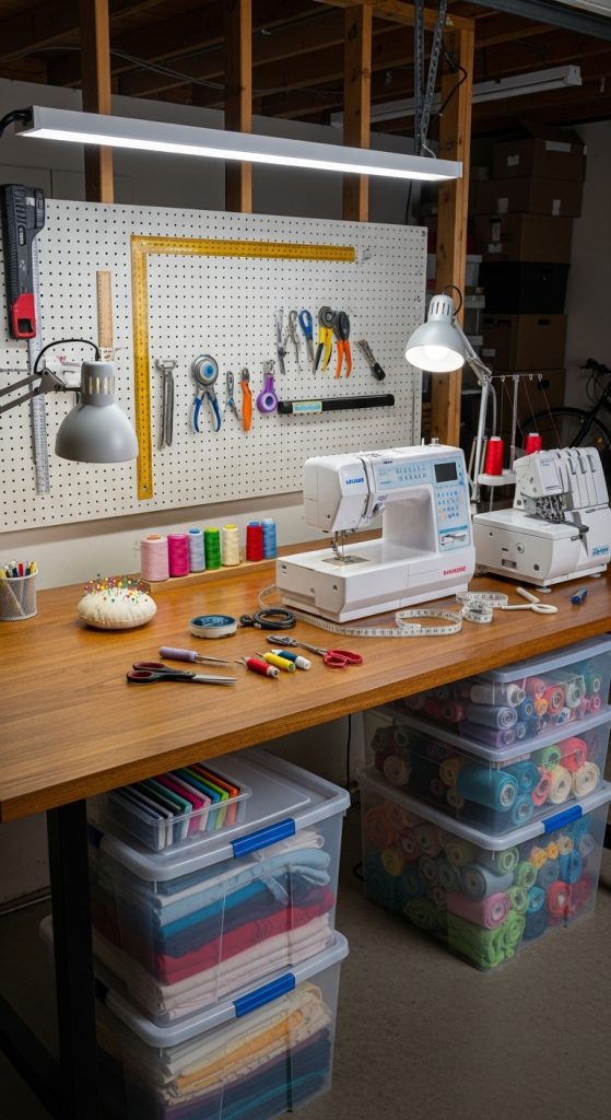 Garage sewing setups are ideal because they allow for larger fabric layouts and reduce disruption to living spaces. Projects can range from clothing and quilts to home décor and seasonal crafts.
