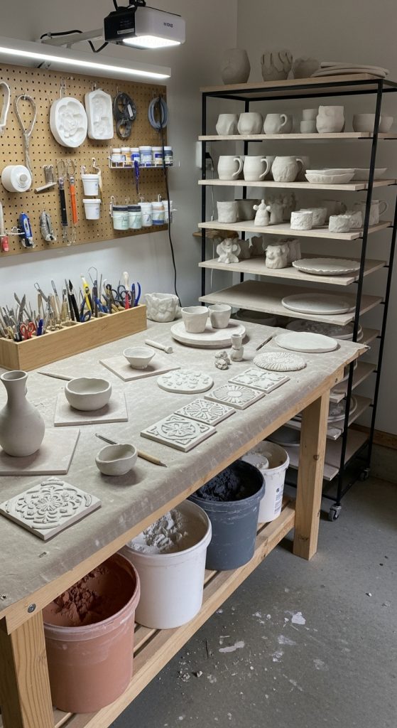 Pottery and clay crafts require a designated area to handle messy materials. A garage is ideal for pottery wheels, clay tables, and drying racks.