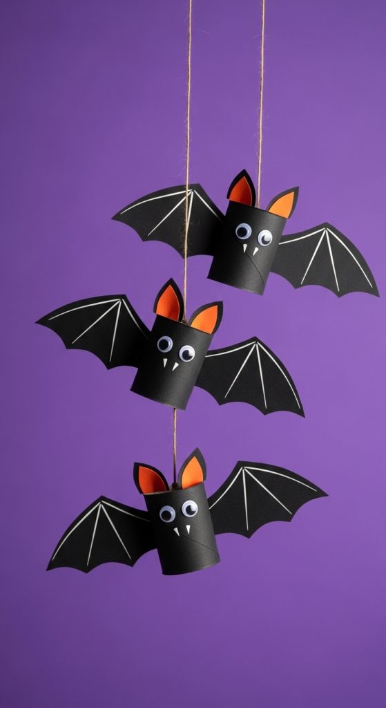 Save your toilet paper rolls and turn them into fun bat decorations. Paint the rolls black, fold in the top edges to create ears, and glue on paper wings. Add googly eyes or draw glowing yellow ones for a spooky effect. These bats can be hung on walls, strung into garlands, or scattered around for creepy-cute dรฉcor.