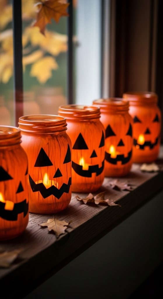 Turn empty glass jars into glowing jack-oโ-lanterns. Paint the outside of the jars orange, then use black paint or adhesive vinyl to create jack-oโ-lantern faces. Insert LED tea lights, and youโve got festive decorations for windowsills, porches, or party tables.