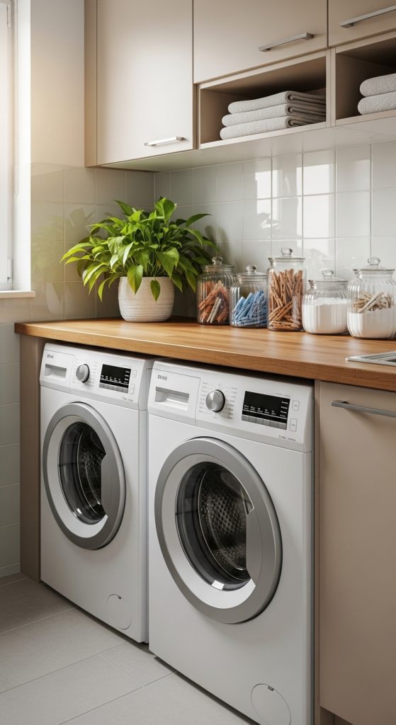 Stacking your laundry units maximizes vertical space, turning even a narrow corner into a functional cleaning hub.