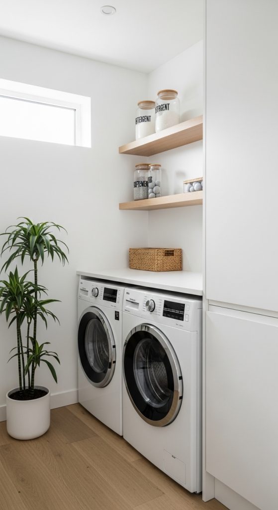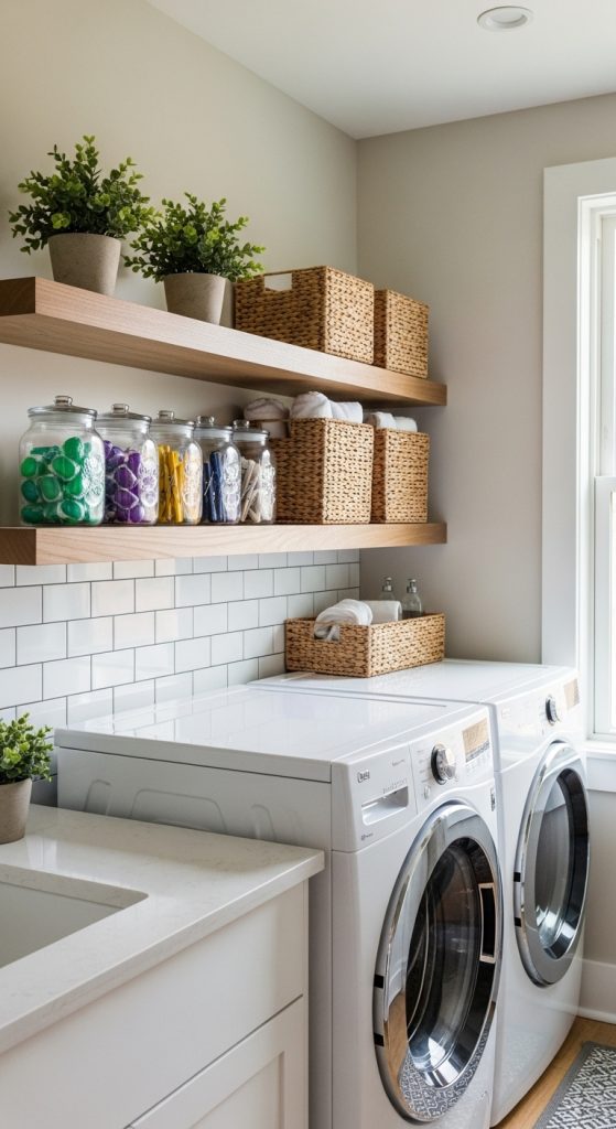 Vertical storage is the key to optimizing a small laundry room. Floating shelves add both utility and style without occupying floor space.