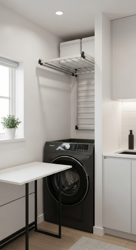 This clever solution saves space and keeps your laundry area tidy, blending functionality with minimal design.