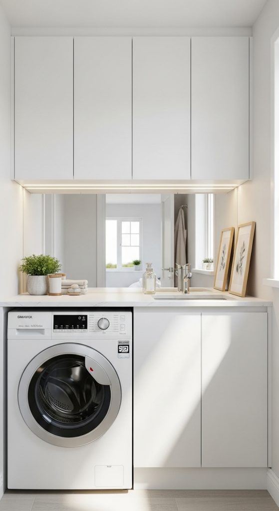 Good lighting is crucial in a small laundry space. Combining strategic lighting and mirrors can make the room feel larger and more inviting.