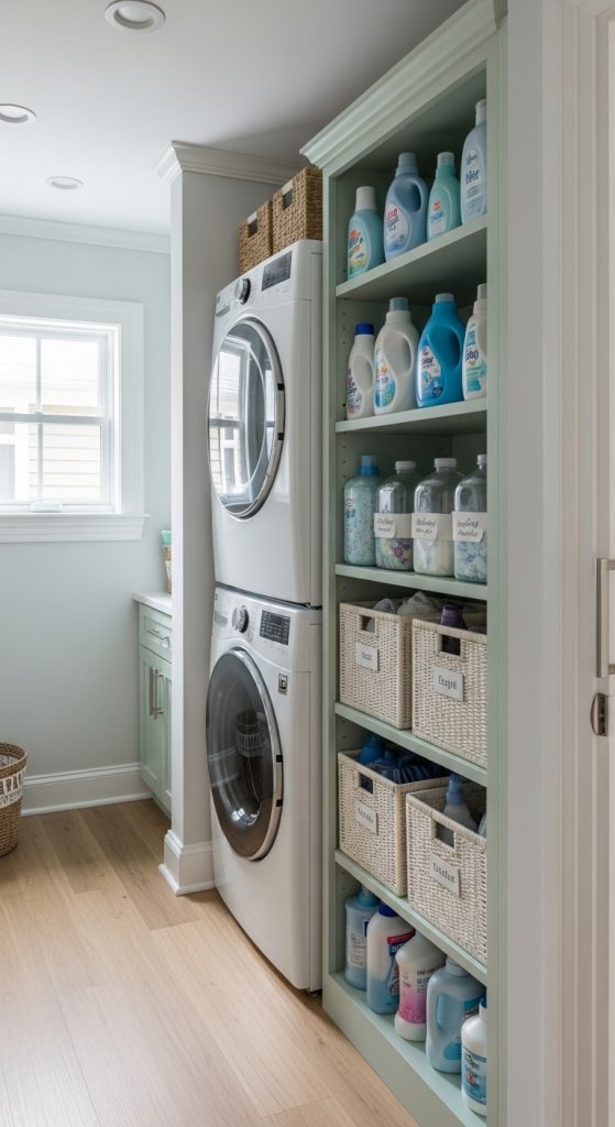 Slim storage maximizes small gaps while keeping the laundry area functional and tidy.