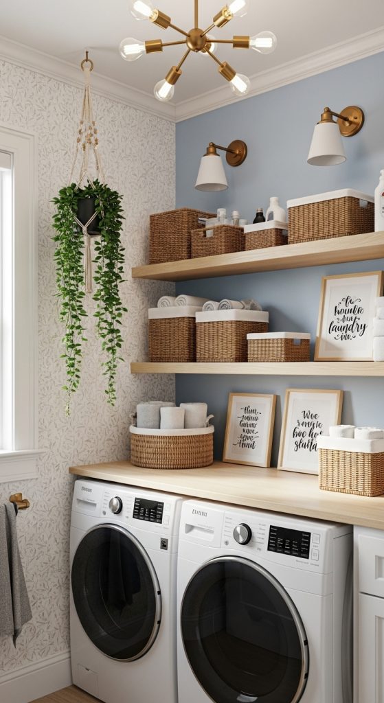 - Add framed art, a hanging plant, or motivational laundry quotes.