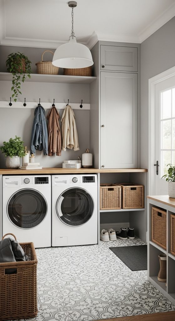 Combining laundry with mudroom elements creates a practical dual-purpose area that’s both stylish and efficient.
