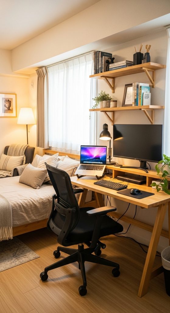 The workspace can be set up in a corner, under a lofted bed, or beside a window for natural light. Adding a bookshelf or wall-mounted storage keeps the zone organized and distinct from the rest of the apartment.