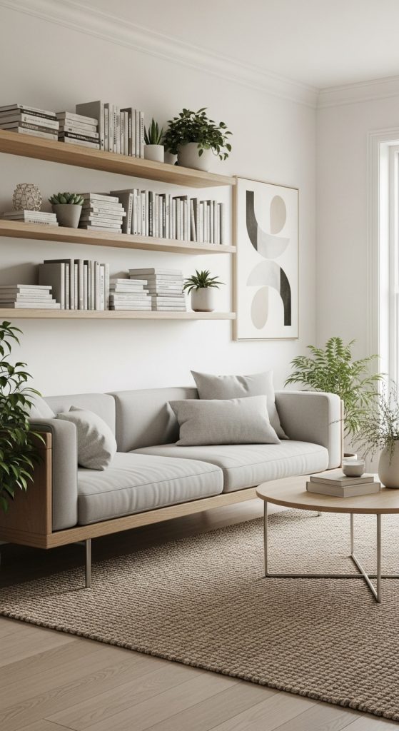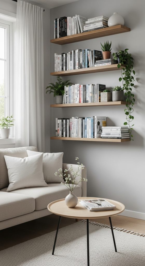 - Install corner floating shelves to display books, decor, or plants, keeping the roomโs flow uninterrupted.