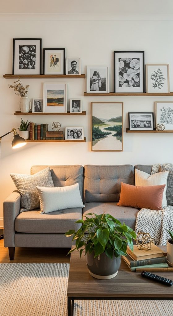 This approach allows you to curate a personal art collection without taking up floor space, making it ideal for small rooms.