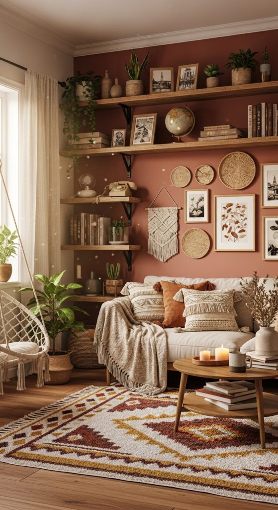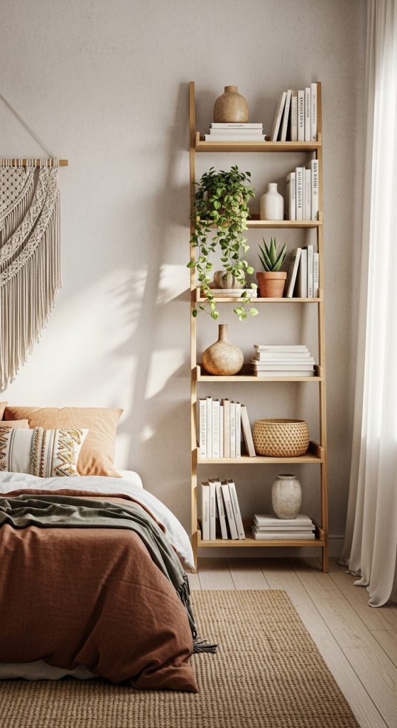 For an eclectic or bohemian-inspired room, floating ladder shelves are a unique and functional option. These shelves create a sophisticated yet relaxed vibe and are perfect for storing books, plants, or decor.