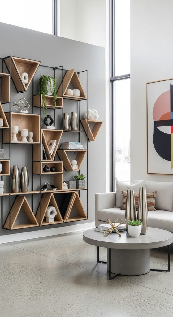 - Install geometric shelves that form interesting patterns on the wall, creating a visually stimulating display.