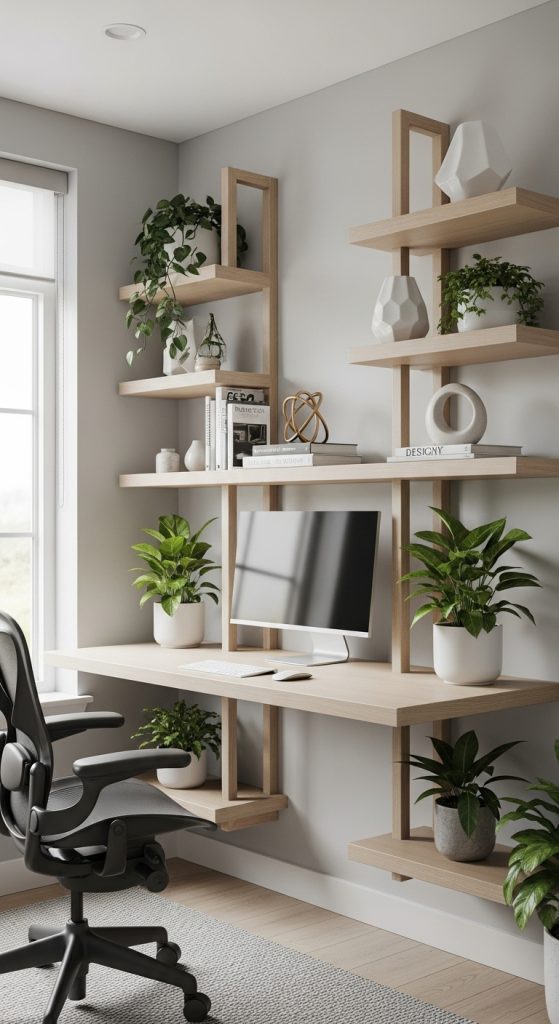 If youโre working with limited space, a floating desk with shelves is a clever way to combine workspace with storage. This multi-functional setup is perfect for a home office or study area, where you need desk space without compromising on style.